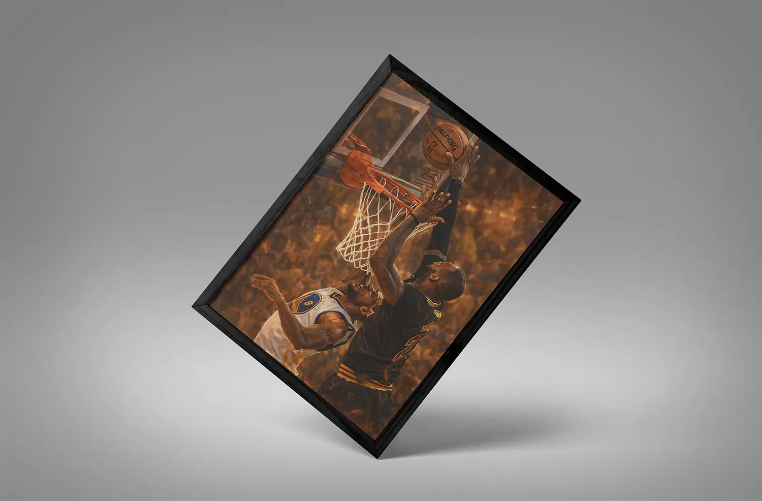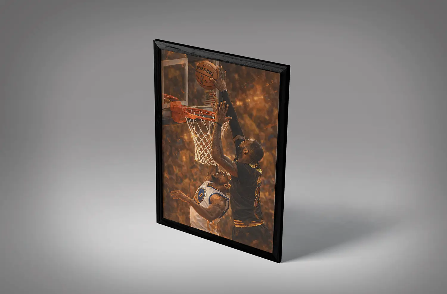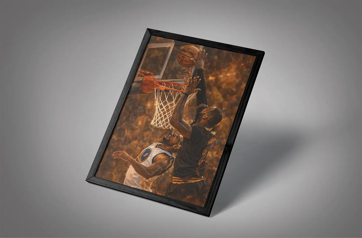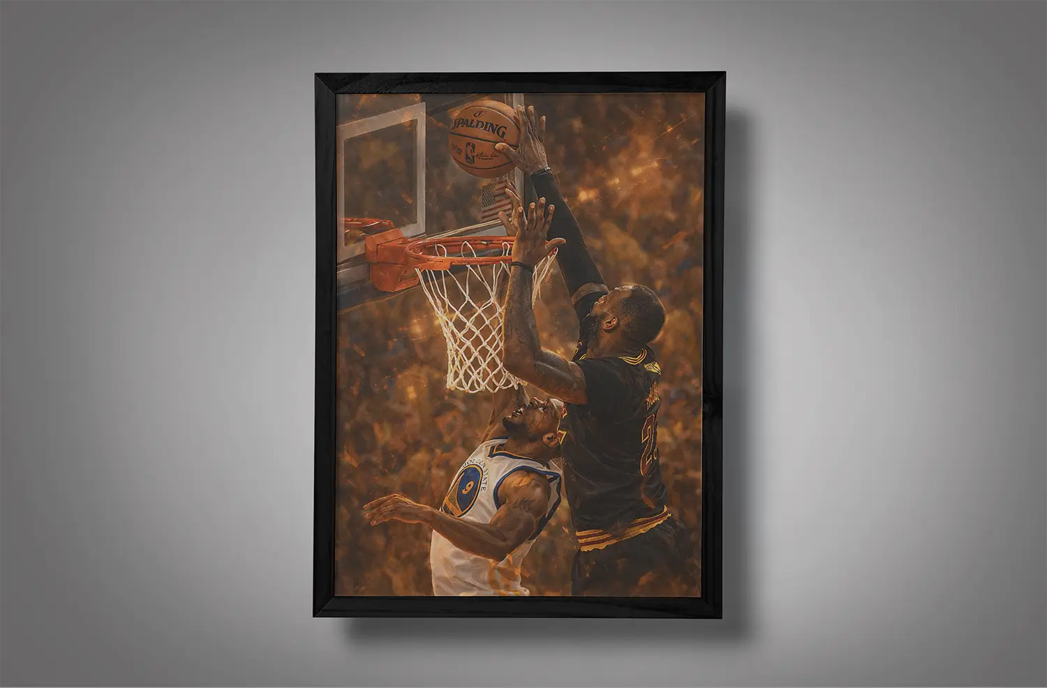 Many NBA wall frames focus on dunks or celebrations. What sets lebron james 2016 finals block iguodala wall art apart is its message.