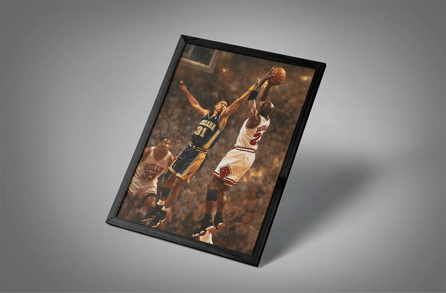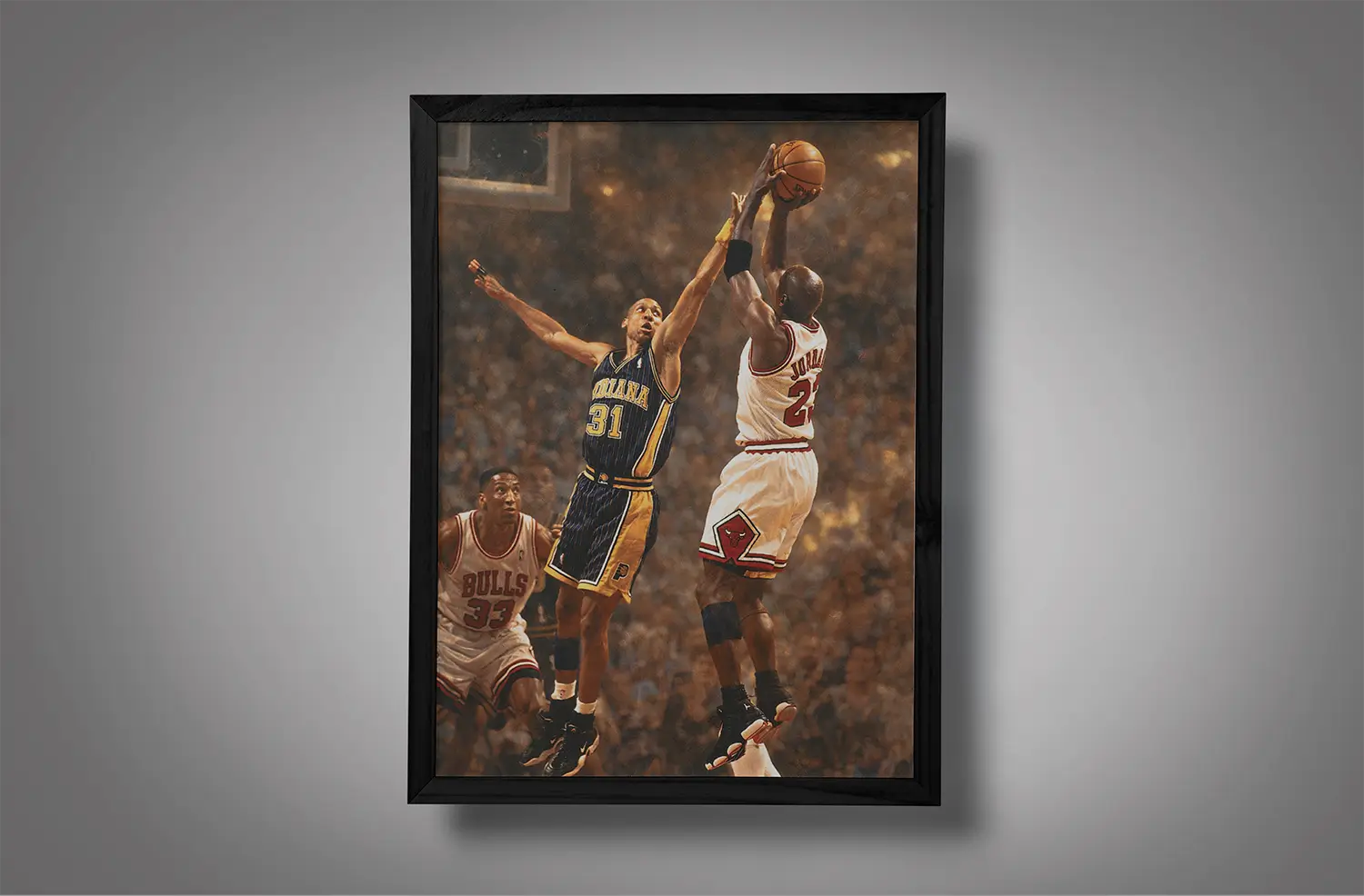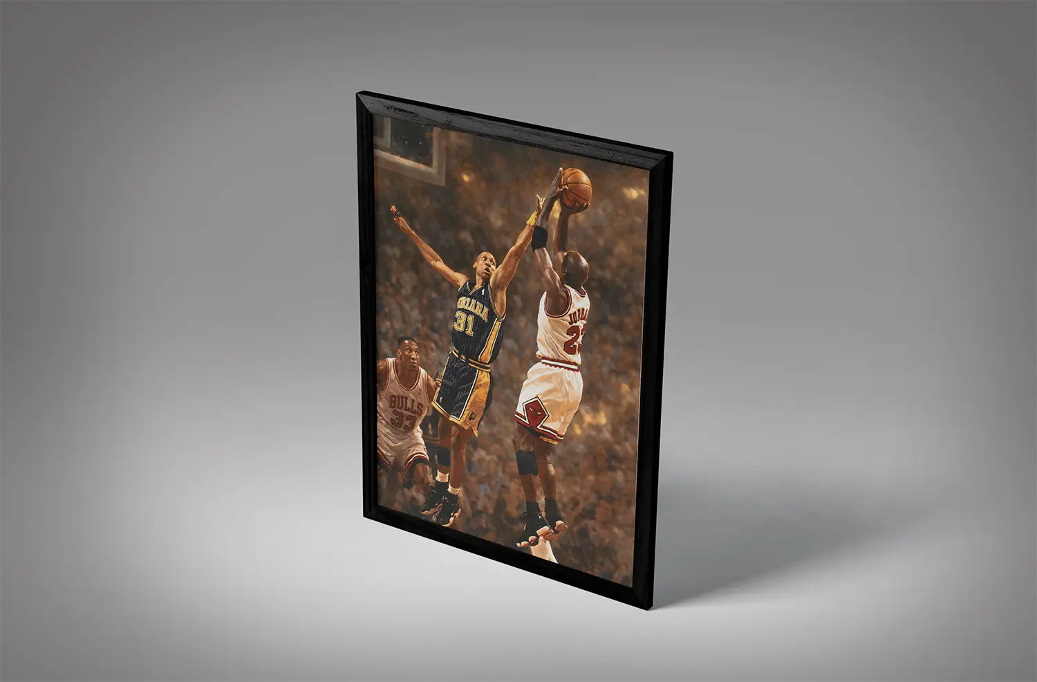 Guests will recognize the moment and ask about it—making this Michael Jordan Reggie Miller fadeaway wall art a natural conversation starter.