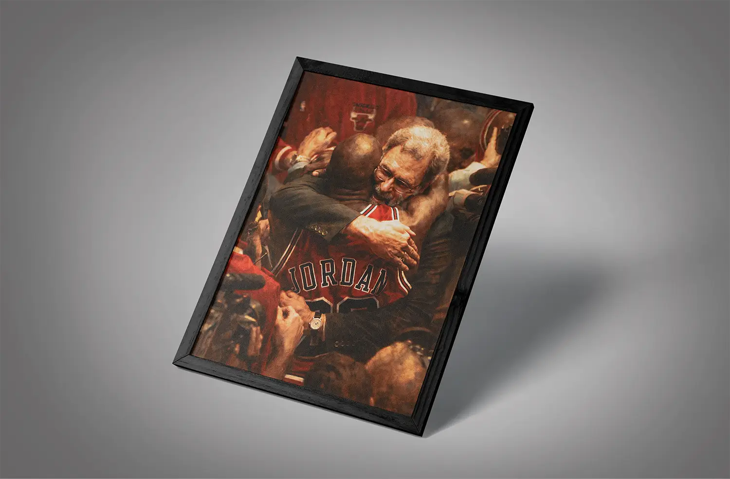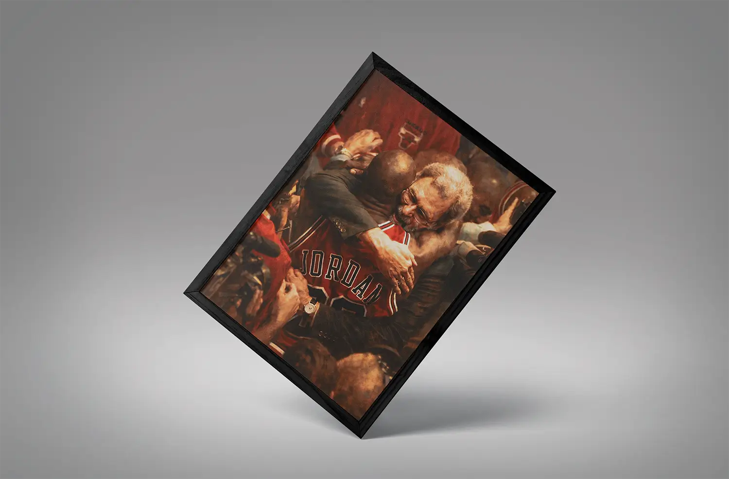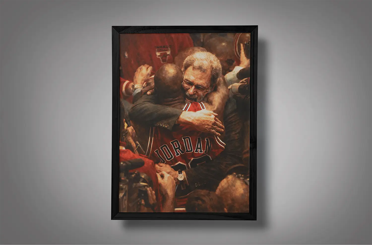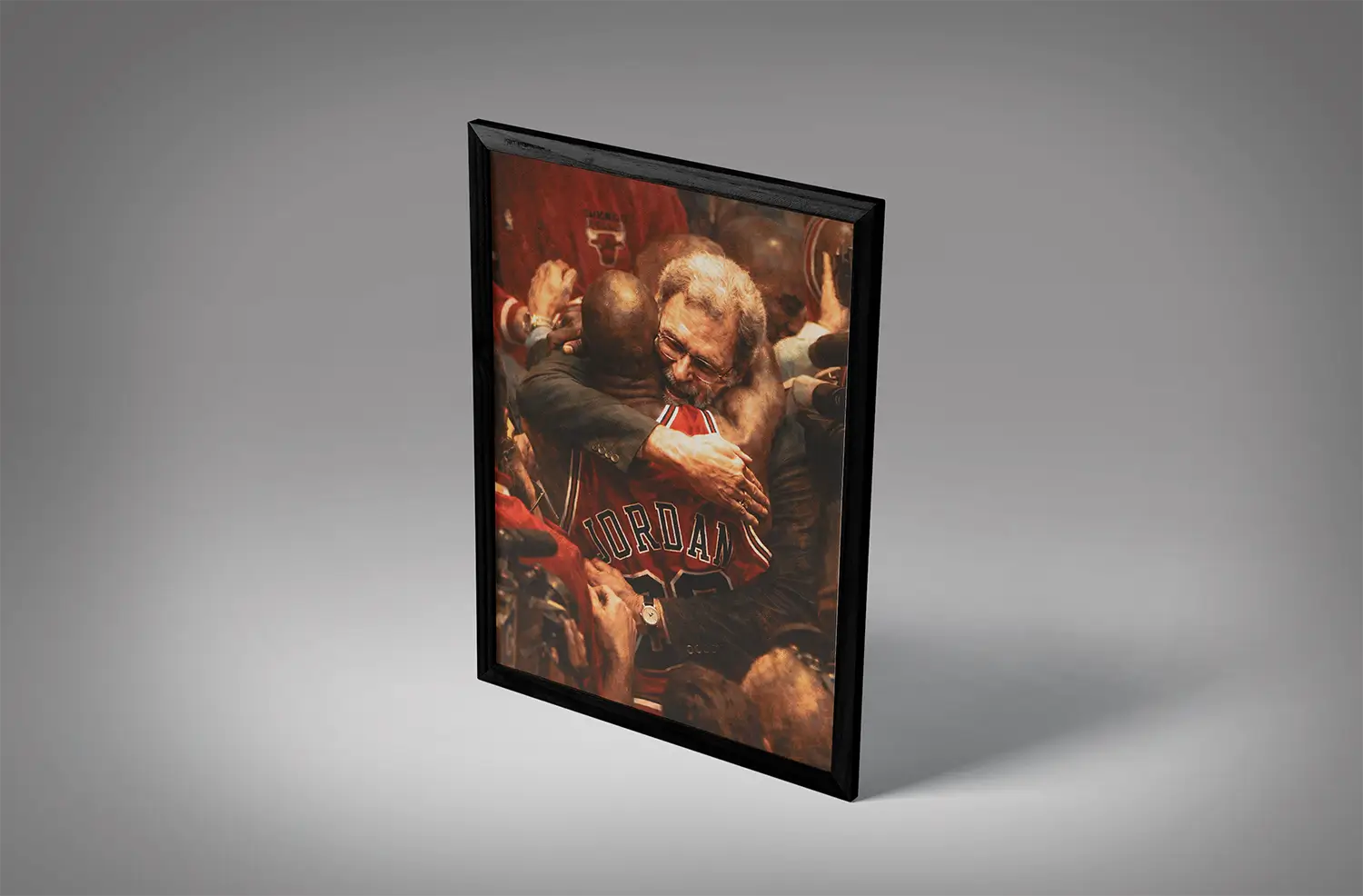 Owning michael jordan and phil jackson hug wall art is about celebrating basketball excellence, leadership, and emotional victory. It captures one of the most respected coach-player relationships in NBA history and turns it into a powerful visual statement for your space.