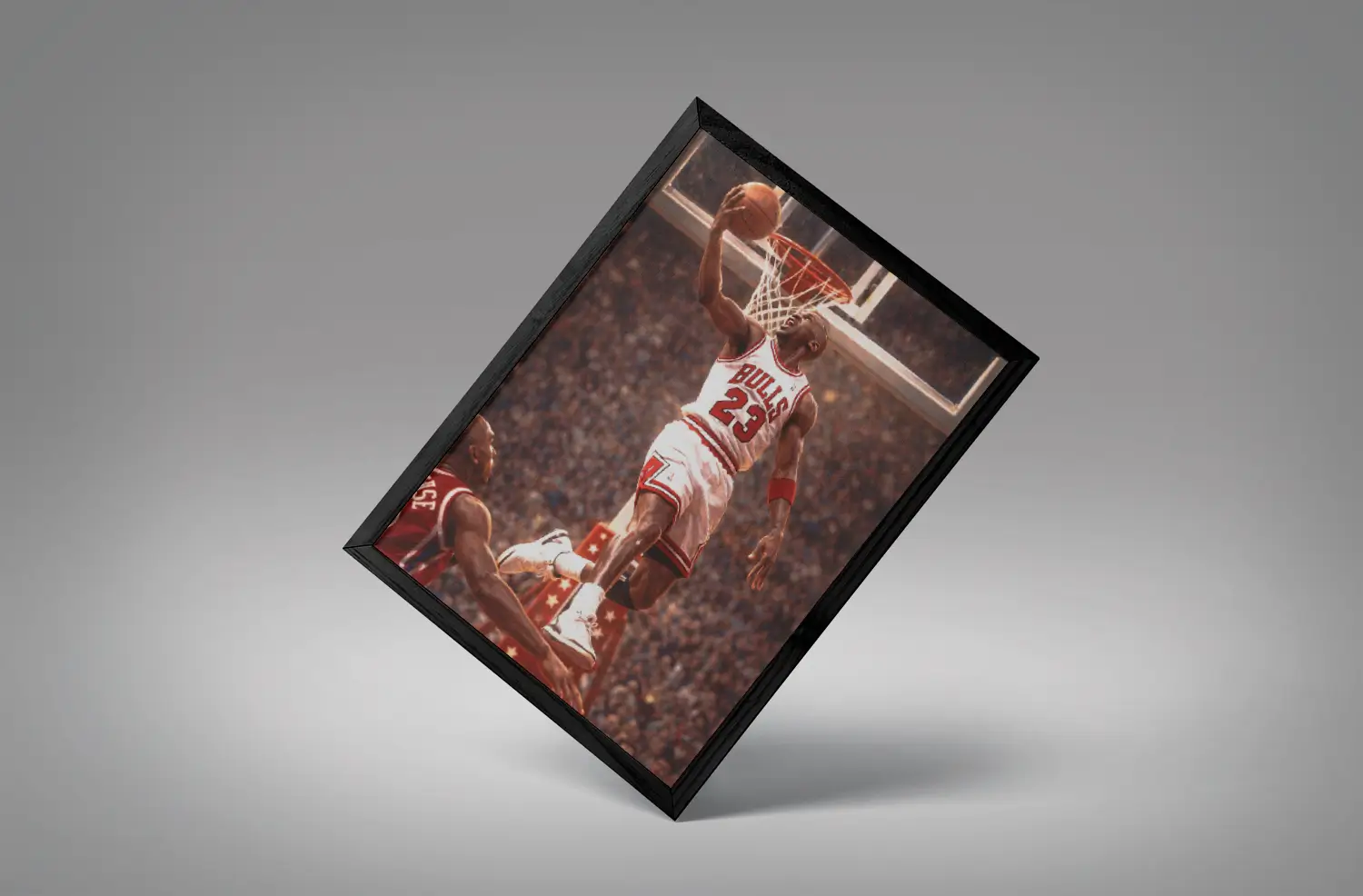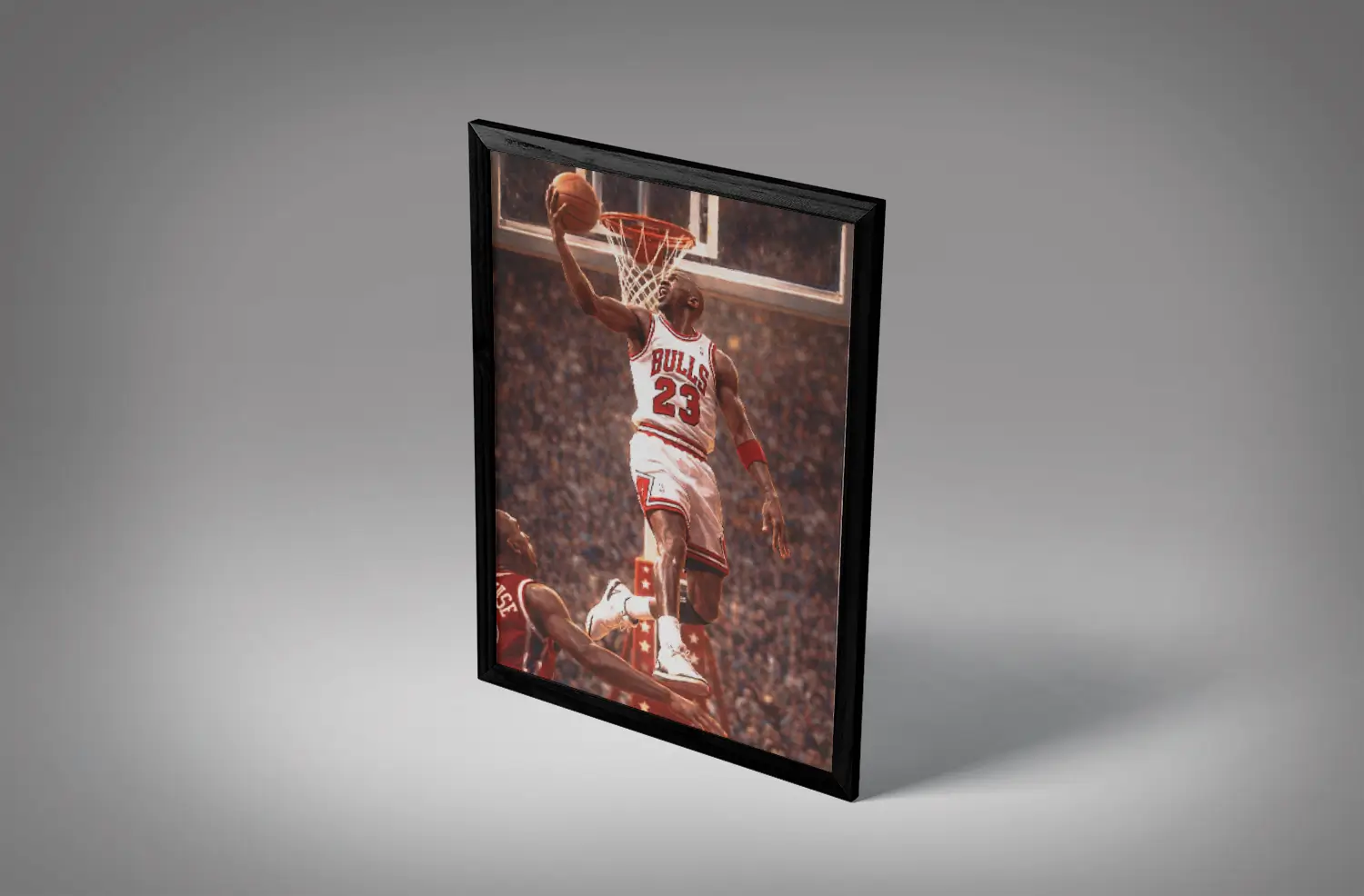 Michael Jordan reverse dunk wall art is a basketball-inspired décor piece that captures the legendary reverse dunk made famous by Michael Jordan during his Chicago Bulls era.