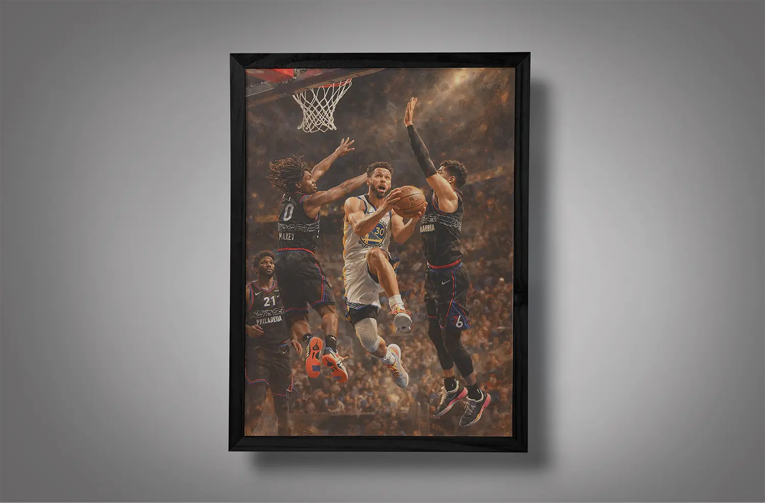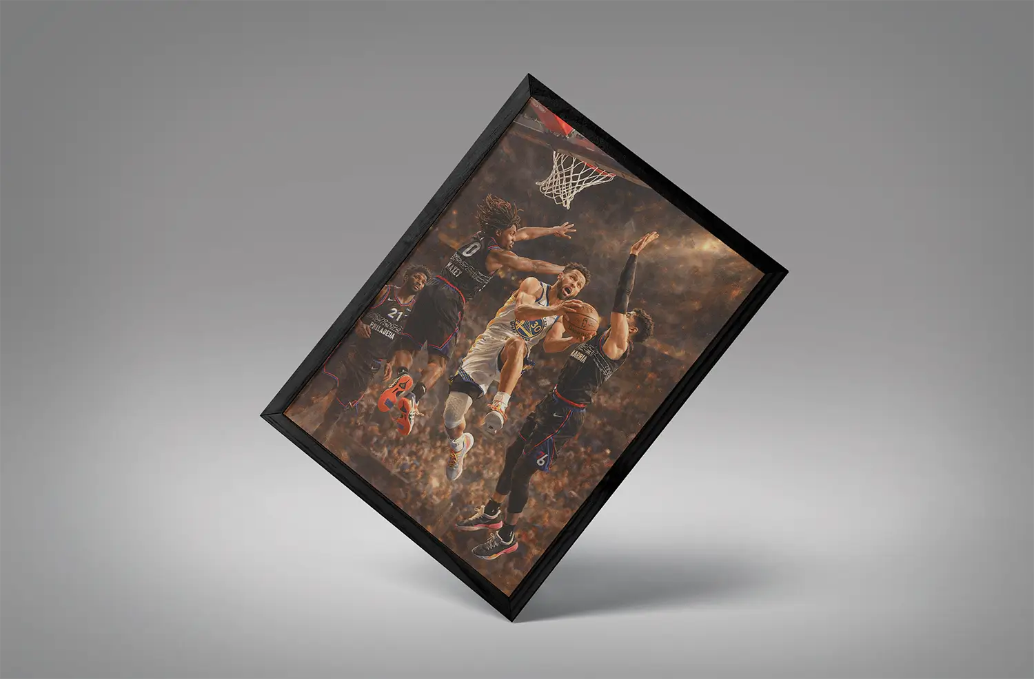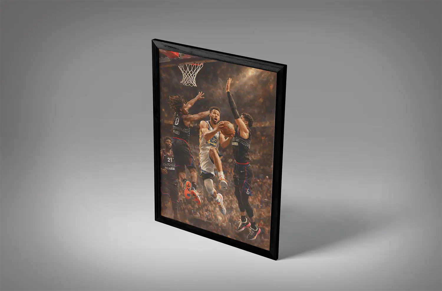 As the face of the modern three-point era, Stephen Curry didn’t just shoot from deep—he mastered finishing at the rim with angles defenders couldn’t predict. His reverse layups are often featured in highlight reels, making them perfect subjects for wall art.