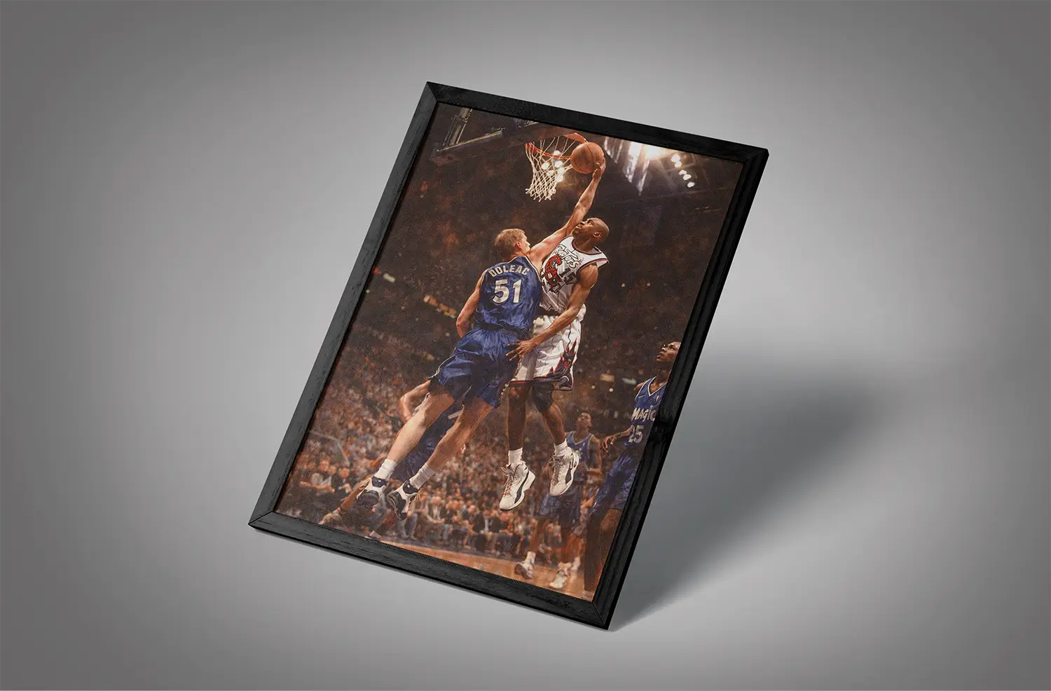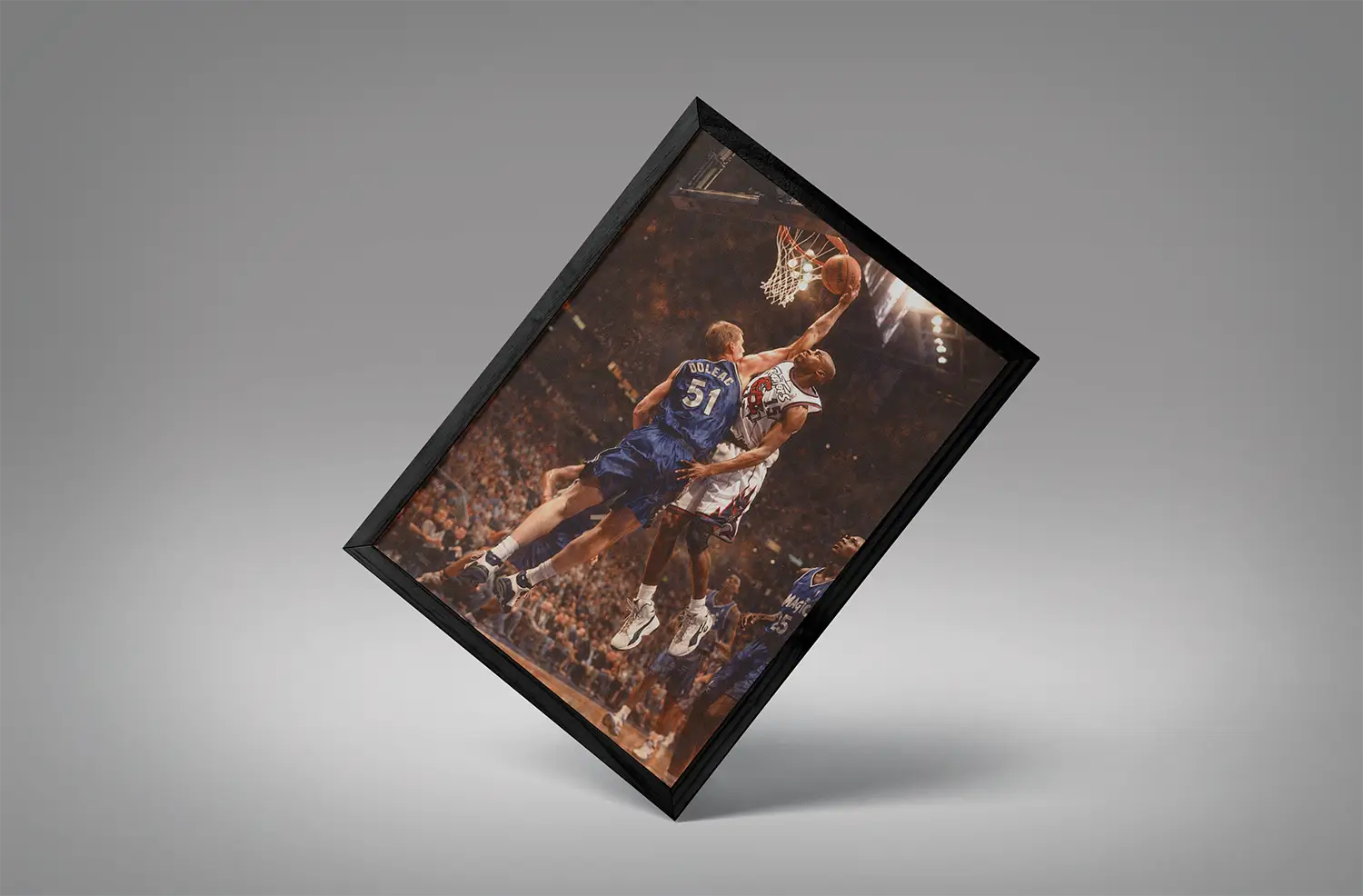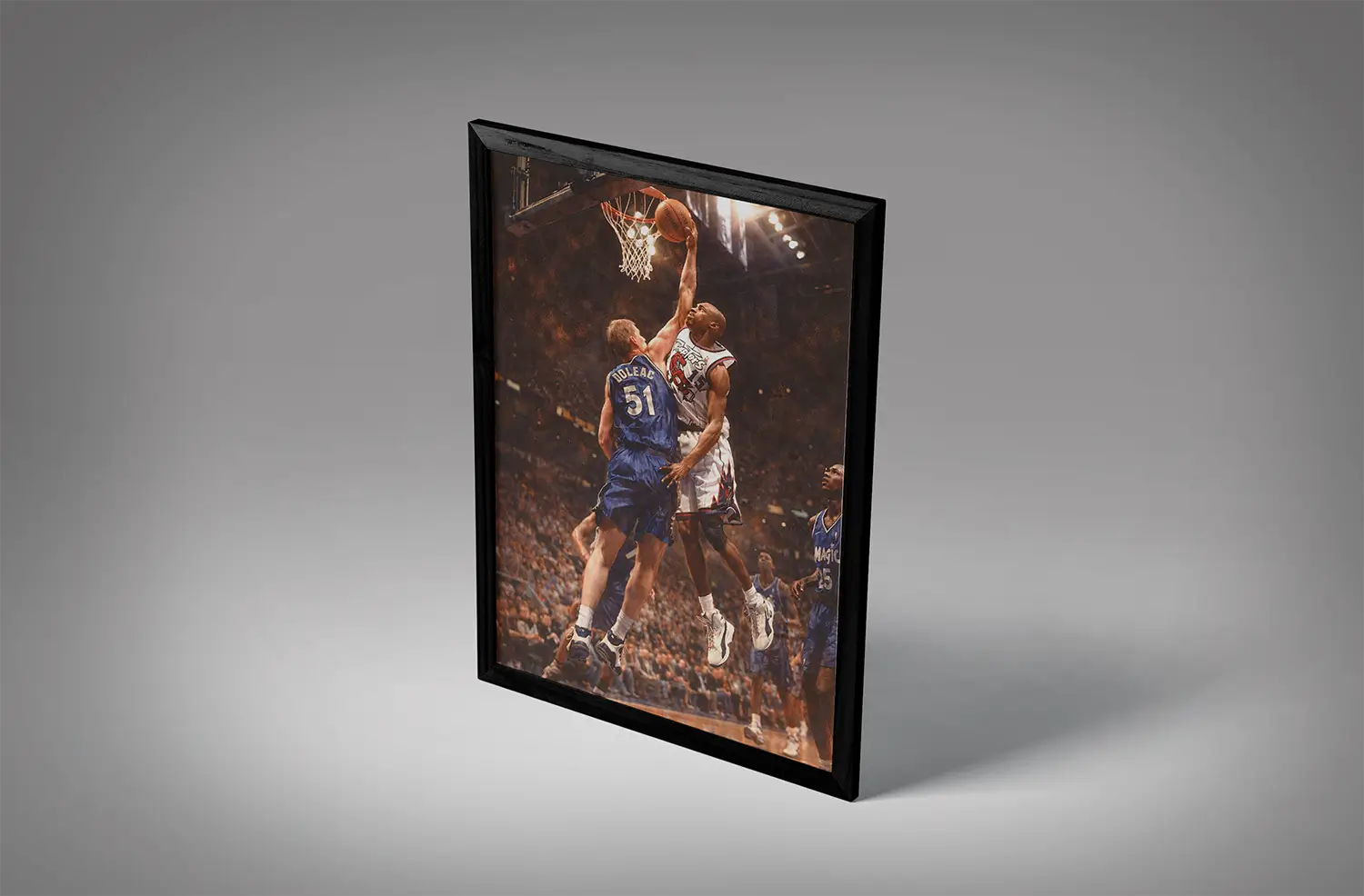 Vince carter dunk on doleac wall art is a basketball-themed wall decor piece inspired by Carter’s powerful dunk over Doleac during his Toronto Raptors era. The artwork freezes the moment where athleticism, confidence, and raw NBA energy collide.