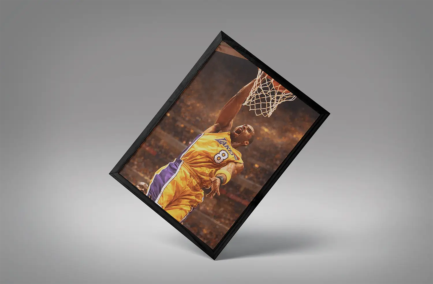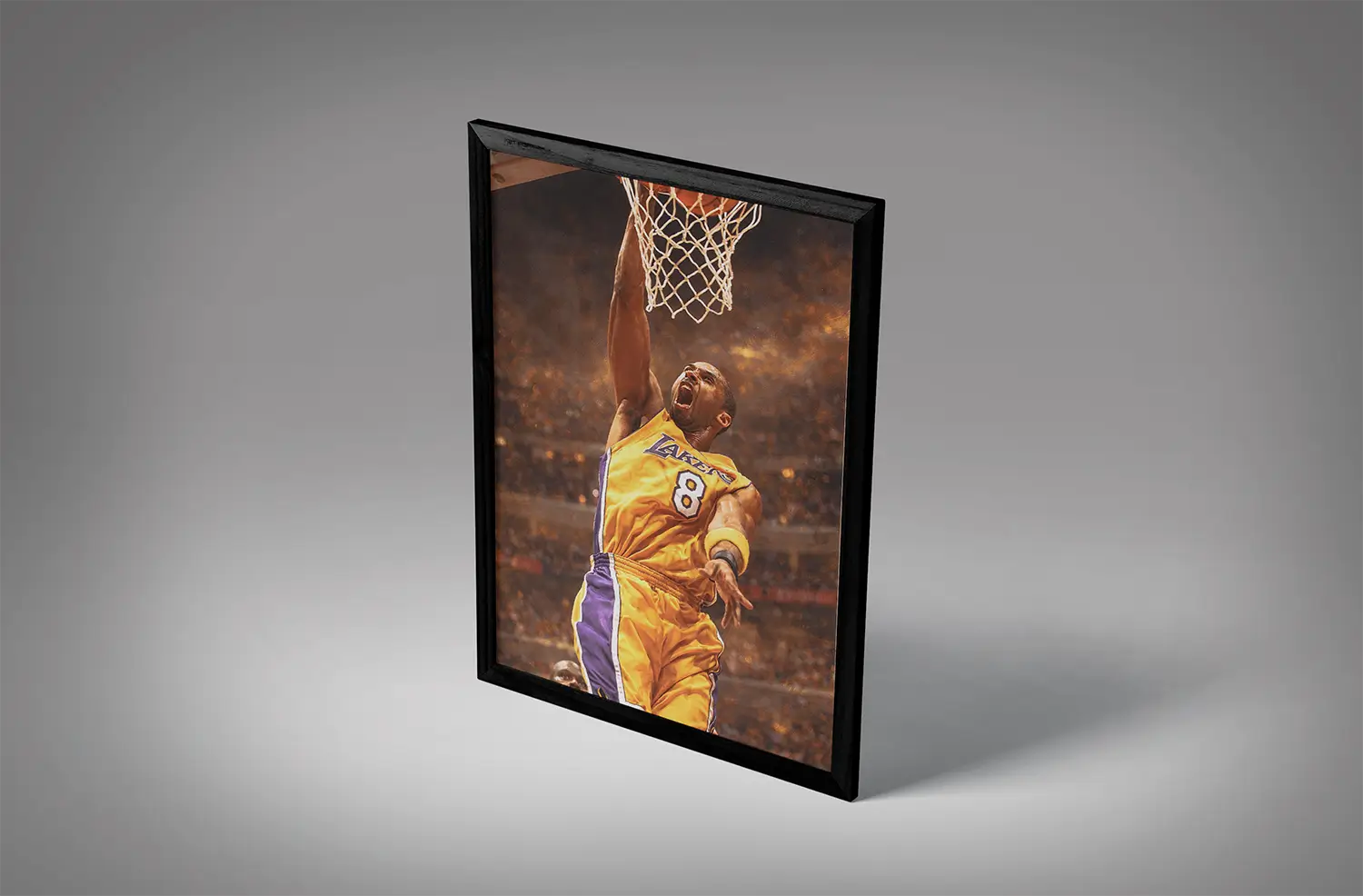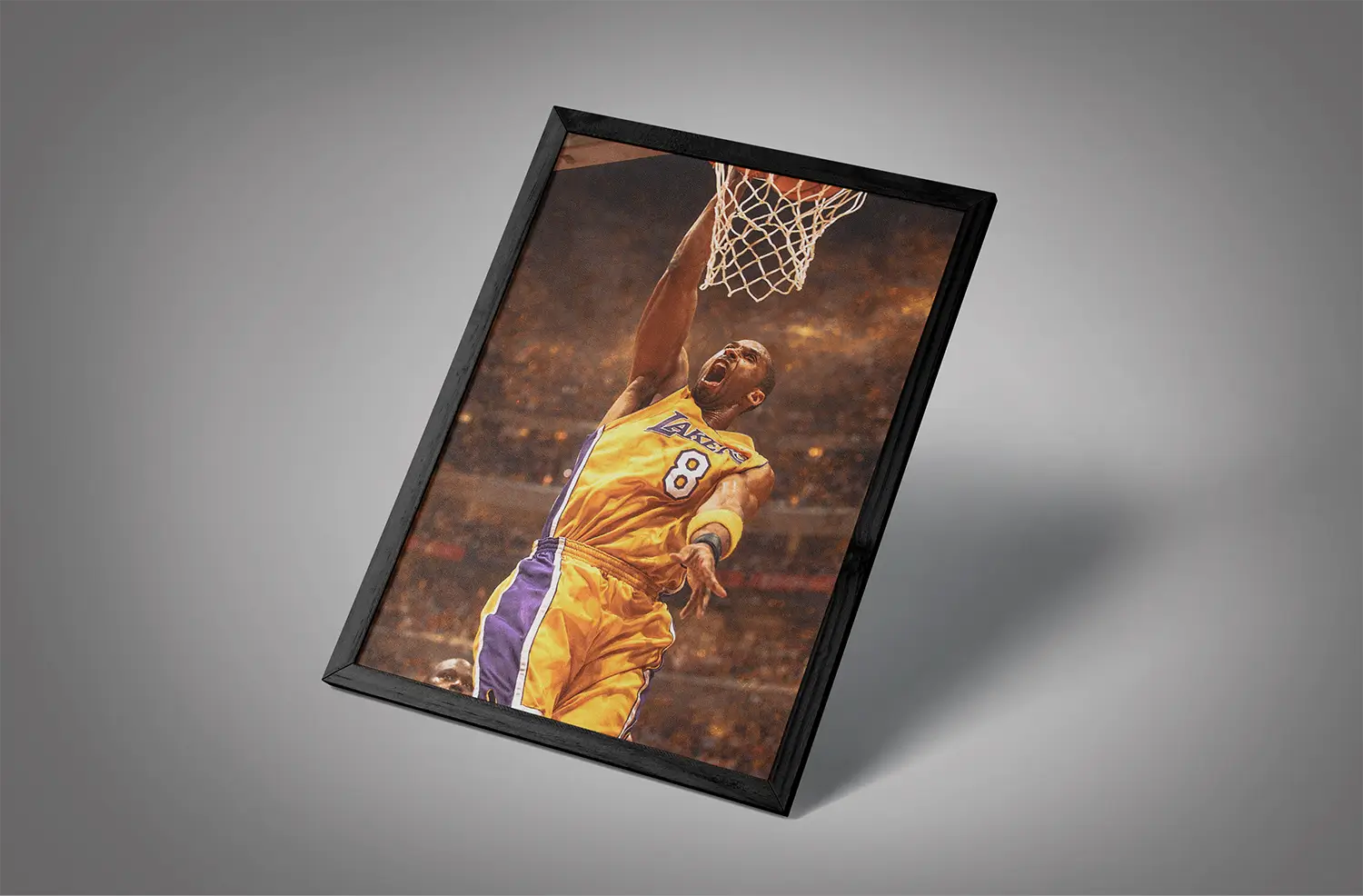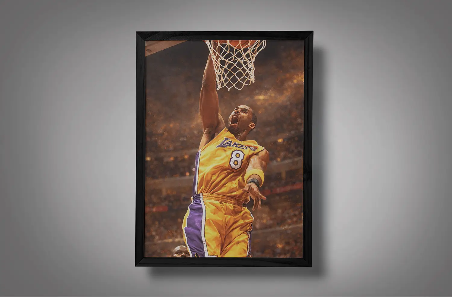 Unlike calm portrait-style frames, young kobe bryant one hand dunk wall art shows movement. The ball cocked back. Defender beaten. Rim under attack.